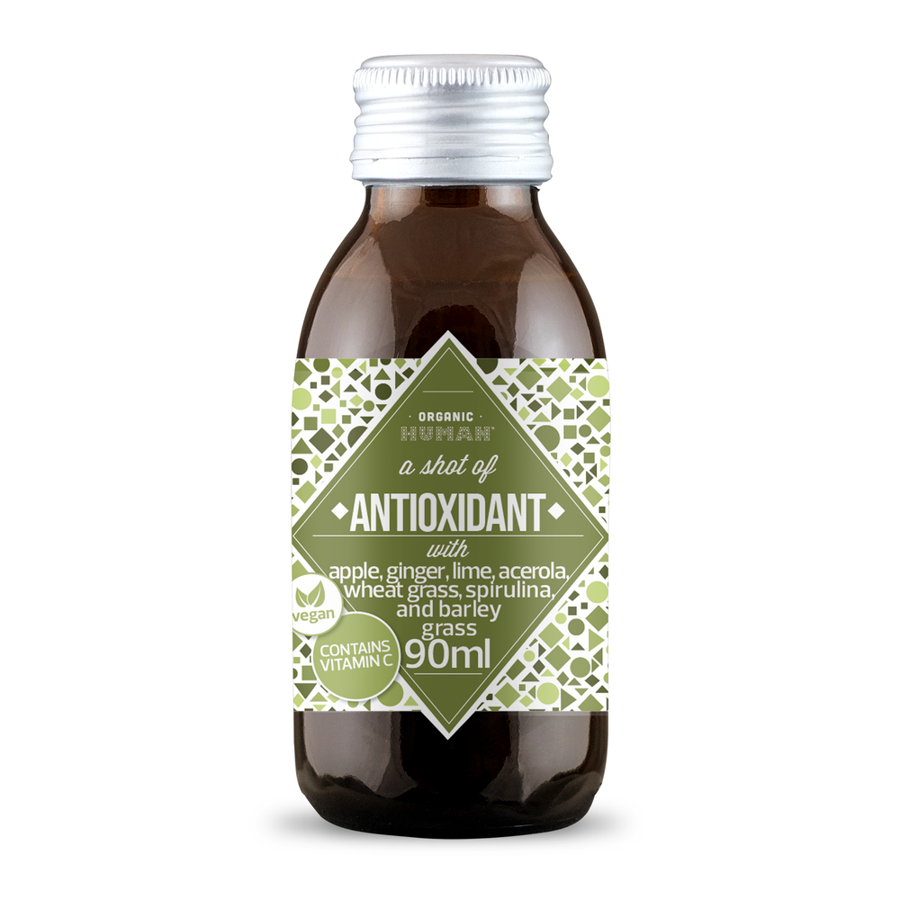 Vi har mixet spirulina, hvedegræs, byggræs & chorella sammen med ingefær, æble og limeolie.